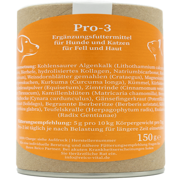 Pro-3 ist eine Mischung aus Kräutern, Hefen, Spurenelementen und Aminosäuren, speziell abgestimmt auf Haut- und Fellprobleme. Es wurde zur Anwendung bei Juckreiz entwickelt. Pro-3 beruhigt und stärkt die Haut und das Fell und kann die Regeneration fördern, sorgt für ein glänzendes Fell.